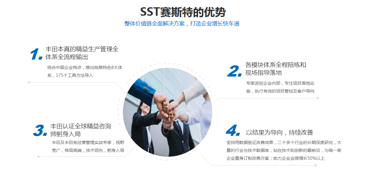 賽斯特集團(SST)是豐田為背景的一家致力于企業(yè)管理咨詢、培訓(xùn)服務(wù)為主的國際化管理咨詢機構(gòu),依托于精益發(fā)源地豐田公司為背景的專家團隊,專業(yè)從事精益生產(chǎn)培訓(xùn)和咨詢服務(wù)的管理咨詢機構(gòu),中國本土唯一一家融合日本豐田,北京現(xiàn)代,韓國三星等專家為一體的咨詢機構(gòu)。旗下?lián)碛校禾旖蛸愃固仄髽I(yè)管理咨詢公司,天津眾益天成管理咨詢公司,北京冠群精益管理咨詢公司,天津精益智能咨詢有限公司等四家分支機構(gòu)。